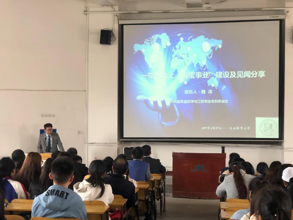 报告会上,魏涛以“一带一路上‘甜蜜事业’建设及见闻分享”为主题,展现了国人在参与“一带一路”建设、助推当地经济发展、改善民生福祉以及保护生态环境等方面的业绩。魏涛讲述:“在这个科技讯速发展并追求绿色环保的时代,我们生工和食品技术将会在科技前沿的道路上越走越远。轻工业的“走出去”面临着巨大的机遇与挑战,我们要善于抓住机遇,迎难而上。而拥有专业的知识储备和技能是我们立足于科技时代所必需的”。同时,魏涛学长鼓励生工学子努力学好专业知识,强调“工作业绩与专业背景的关联及重要性”,勉励生工学子要撸起袖子加油干,不断的磨练自己,提高自己的综合能力。