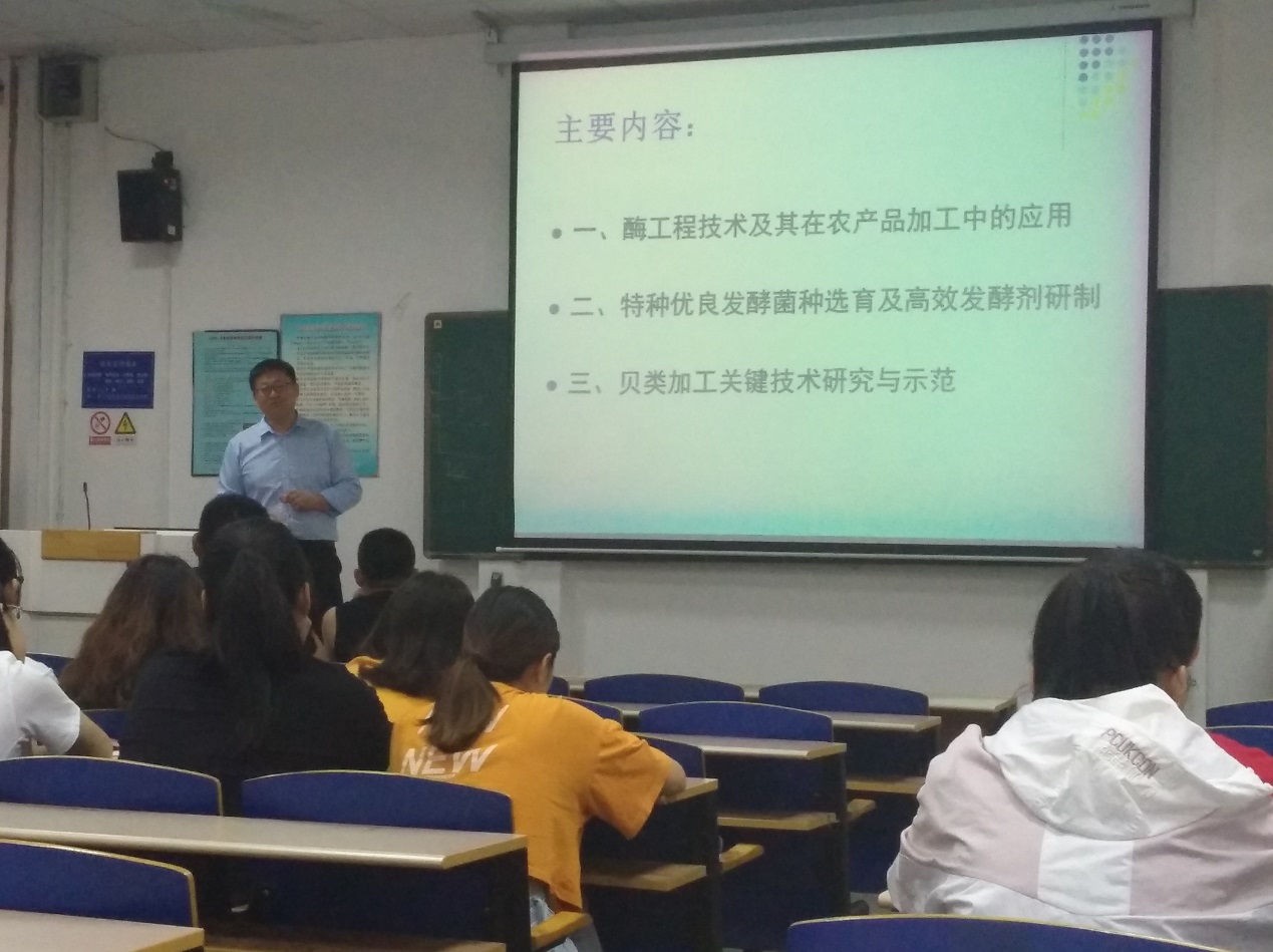 桑经理主要围绕生物技术在食品加工中的应用进行了深入浅出的讲解,结合自己的研究方向重点讲述了酶工程技术及其在农产品加工中的应用、特种优良发酵菌种选育及高效发酵剂的研制、贝类加工关键技术研究与示范等。最后,桑经理介绍了生物技术在食品加工中的应用现状及发展趋势。